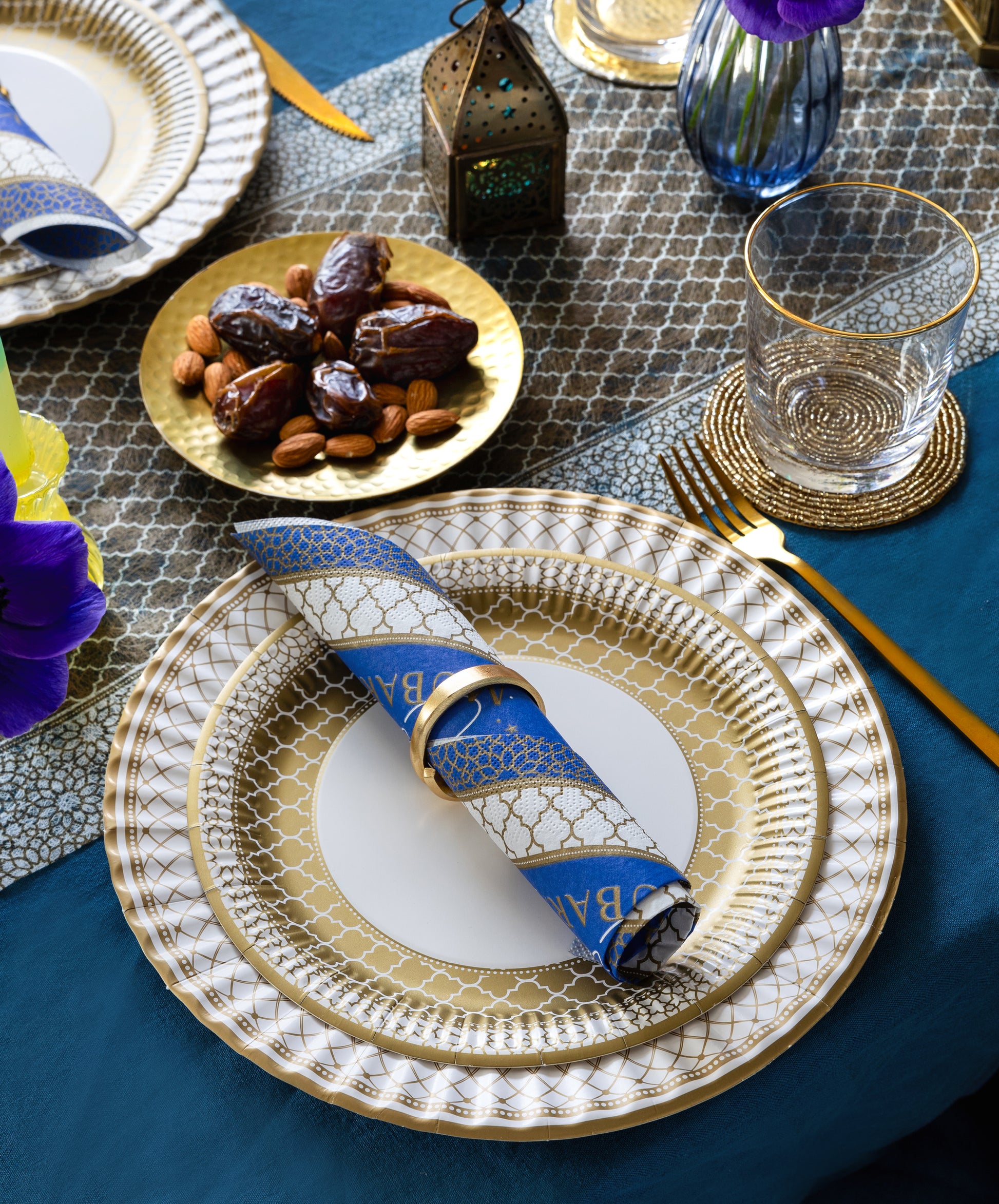 أنشئ طاولة أنيقة ومرتبة مع أطباق ورقية بنقشة فسيفساء باللونين الأبيض والذهبي. تصميم الفسيفساء الراقي يمنحك مظهراً فخماً للمناسبات مع تنظيف سهل بعد انتهاء الحفل. كما أنها بدون بلاستيك وقابلة لإعادة التدوير.