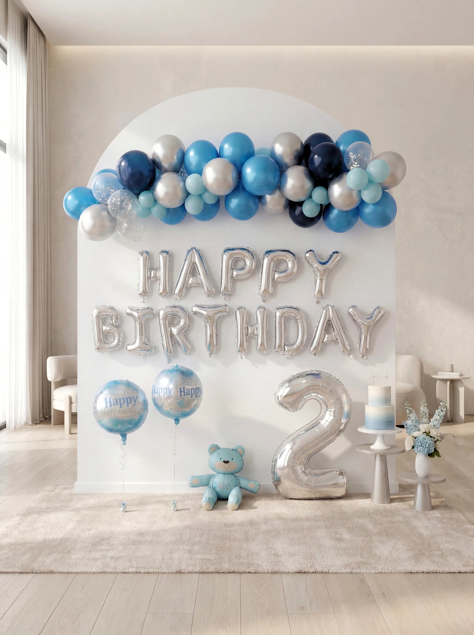 حوّل عيد ميلاد طفلك إلى احتفال مميز مع هذا الطقم بدرجات اللون الأزرق. تم تنسيقه بعناية باستخدام مزيج من تأثيرات Retro و Chrome ليمنحك ديكورًا أنيقًا وجذابًا.